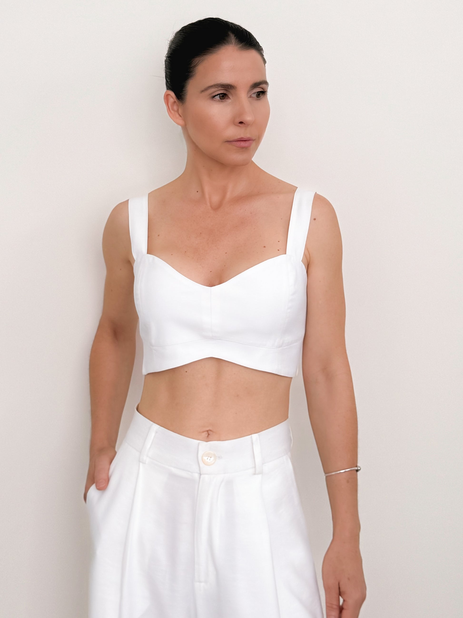 Top com alças, confeccionado em viscose e poliéster, possui modelagem ajustada e fechamento com zíper nas costas.